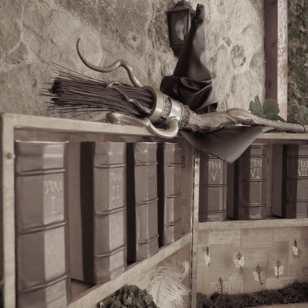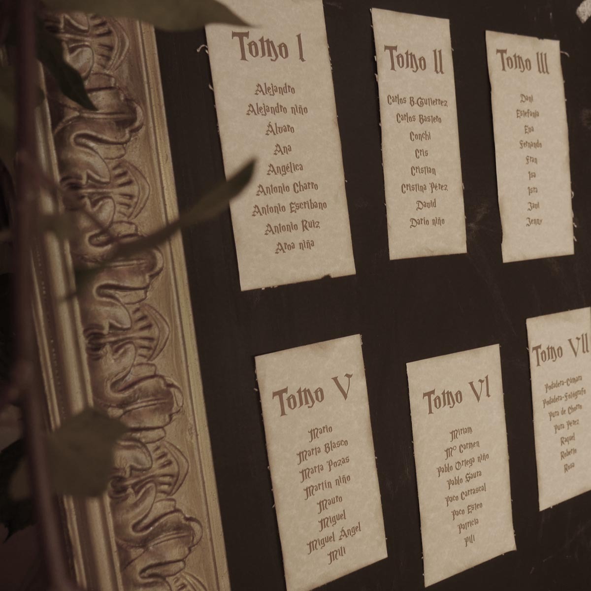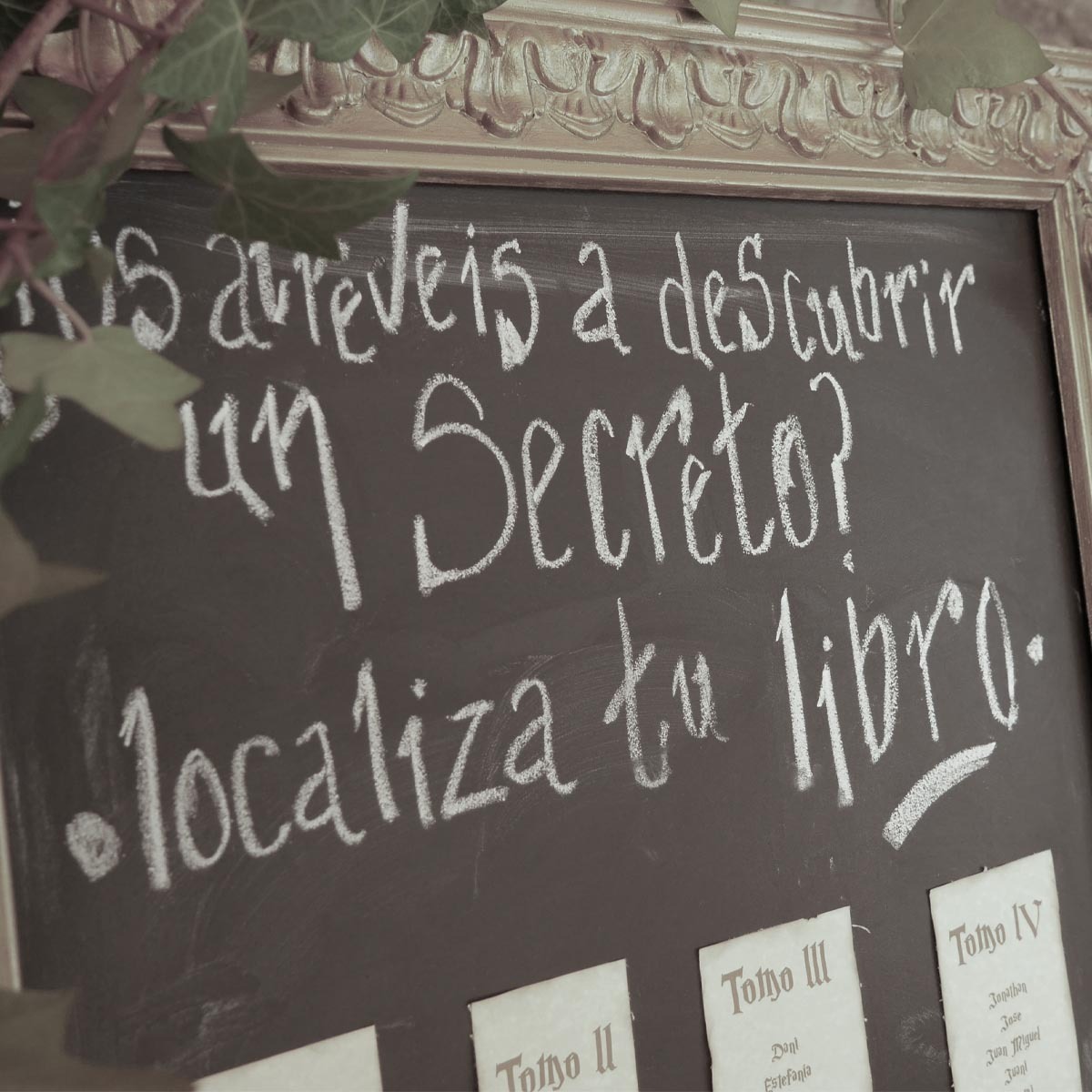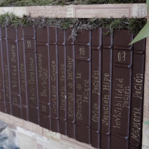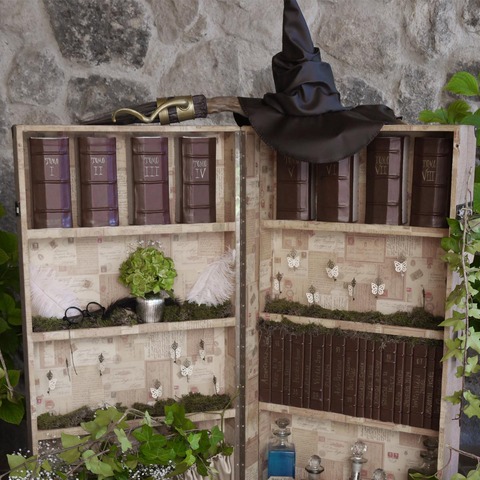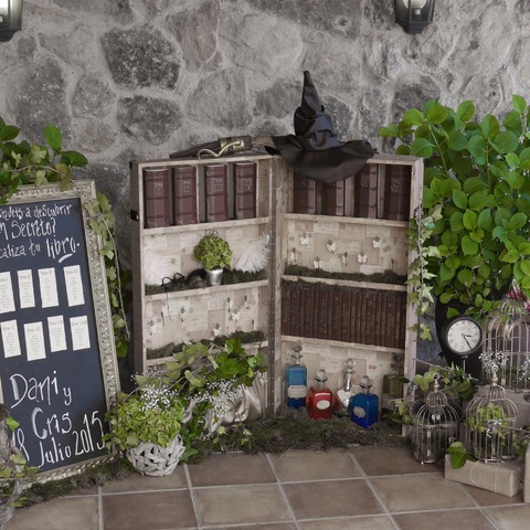 Para el seating plan, recreé una biblioteca encantada: los invitados recogían su carta de aceptación a Hogwarts, y cada aula correspondía a una mesa. El diseño del escudo con sus iniciales y los meseros tipo pizarra completaron una puesta en escena coherente, elegante y profundamente mágica.
