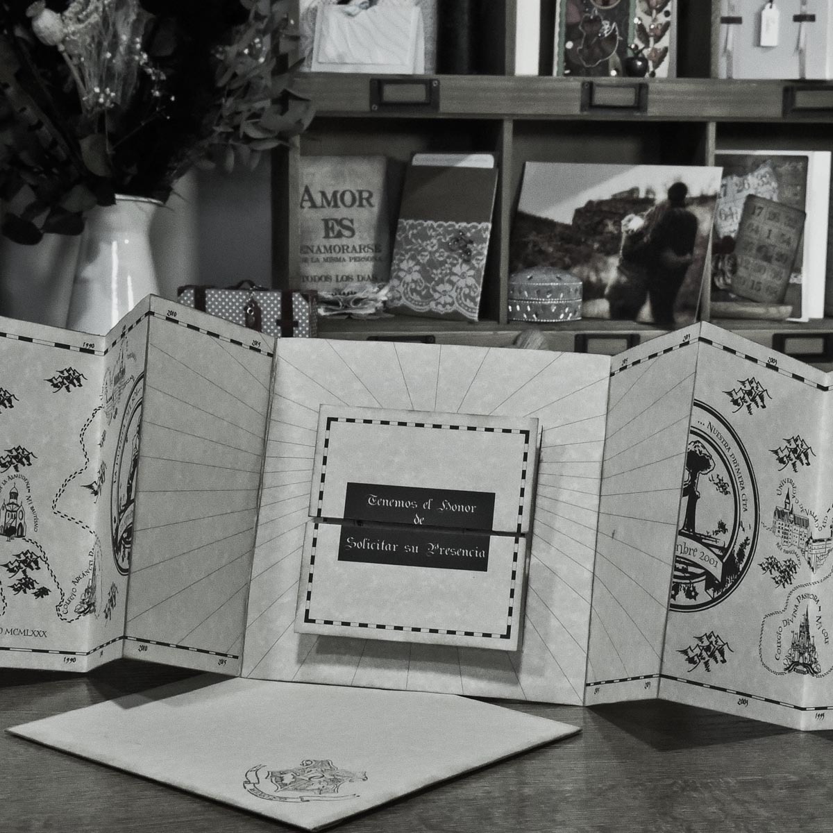 La invitación fue un homenaje al Mapa del Merodeador, transformado en un mapa de vida donde cada hito los guiaba hacia el gran día. Incluso su gato tuvo un lugar especial, como animago resguardado en el castillo de Hogwarts.