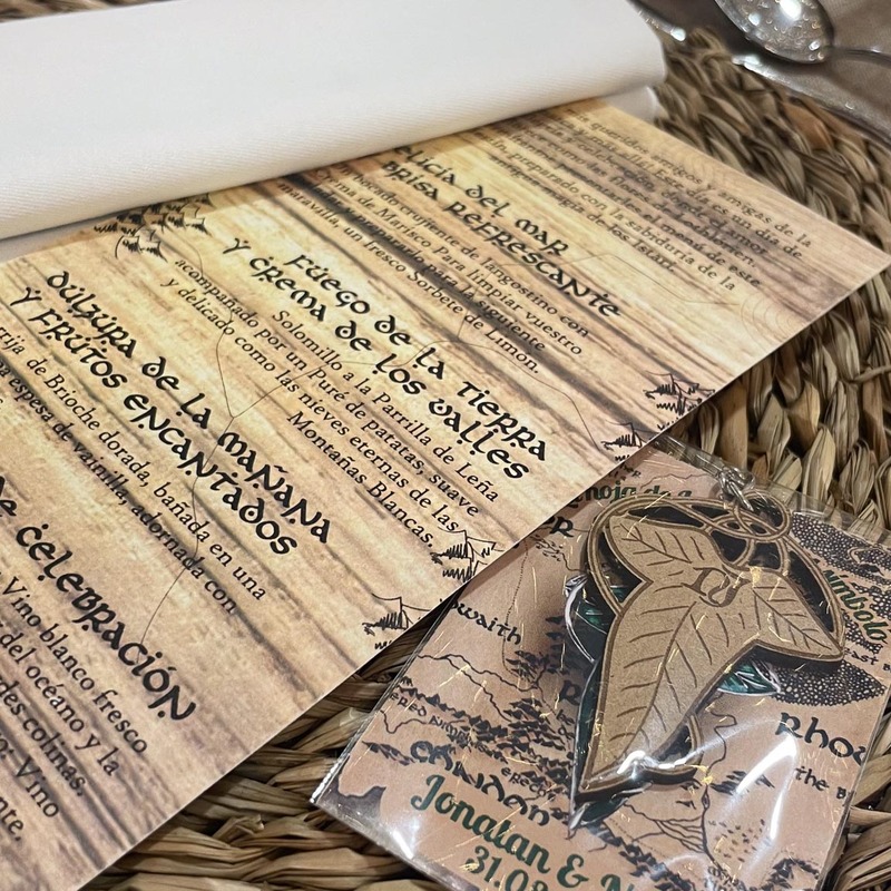 El reto creativo fue unir dos mundos opuestos: la épica fantástica que Jonatan amaba, y los detalles rosas que Noelia soñaba. La historia de Arwen y Aragorn sirvió de inspiración para crear un diseño artesanal, emotivo y lleno de simbolismo. Desde invitaciones con papel hecho a mano y lacre elfo hasta un seating plan con mapa épico y flechas rosa pastel, cada elemento fue pensado para construir una experiencia coherente y personalizada.